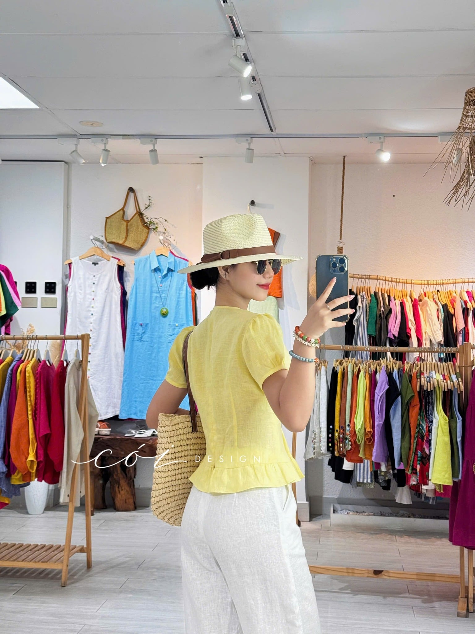 Áo cổ tim tay phồng nhún bèo linen tưng premium Cói Design