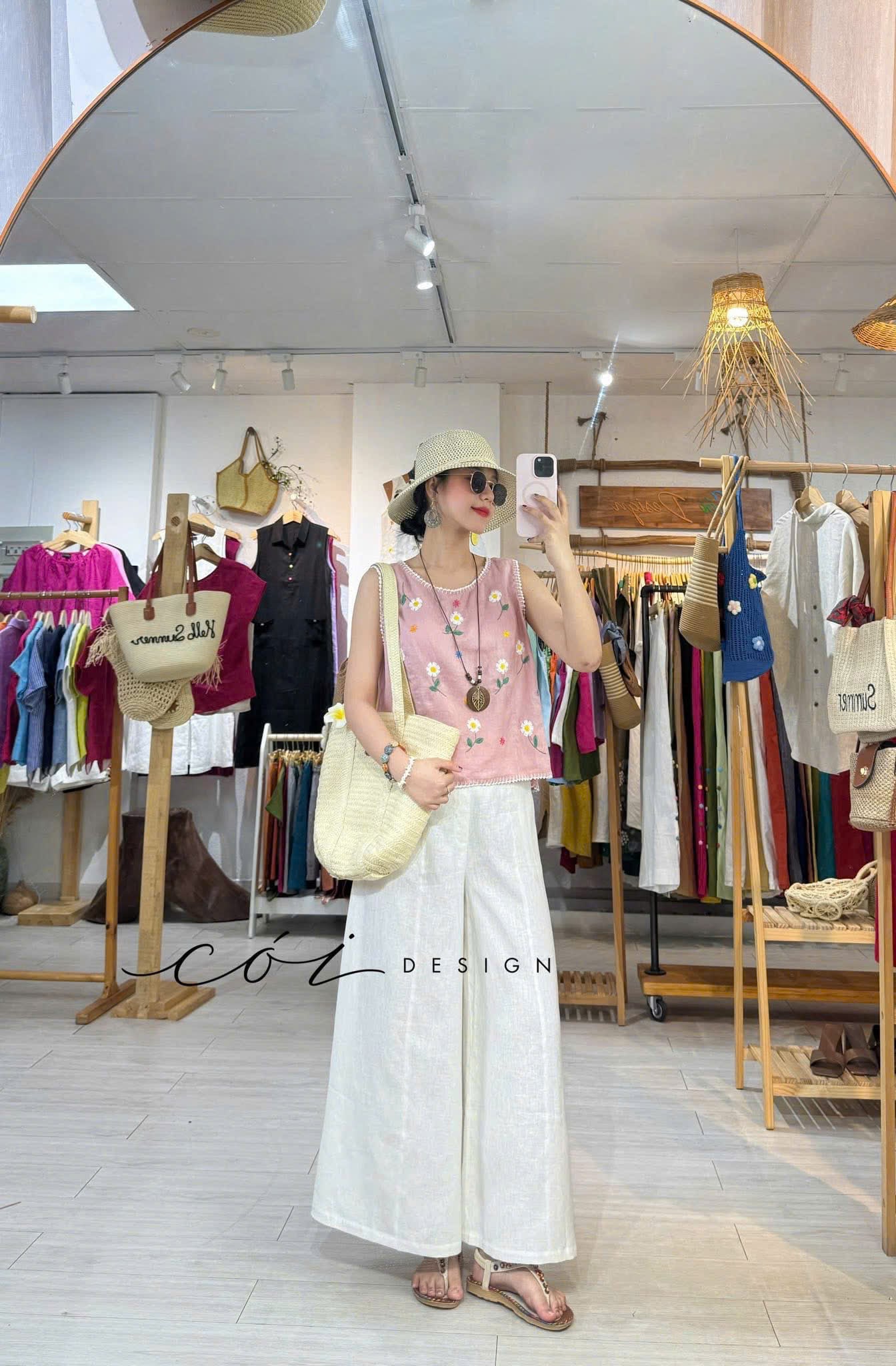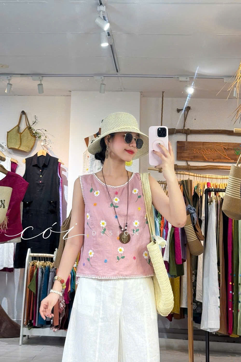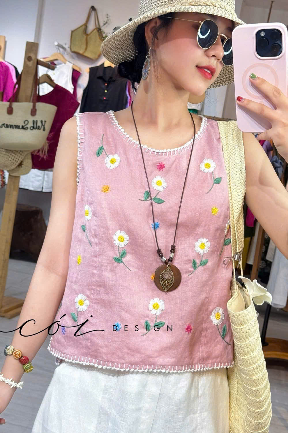 Áo sát nách thêu tay hoa rơi viền sò linen tưng premium Cói Design