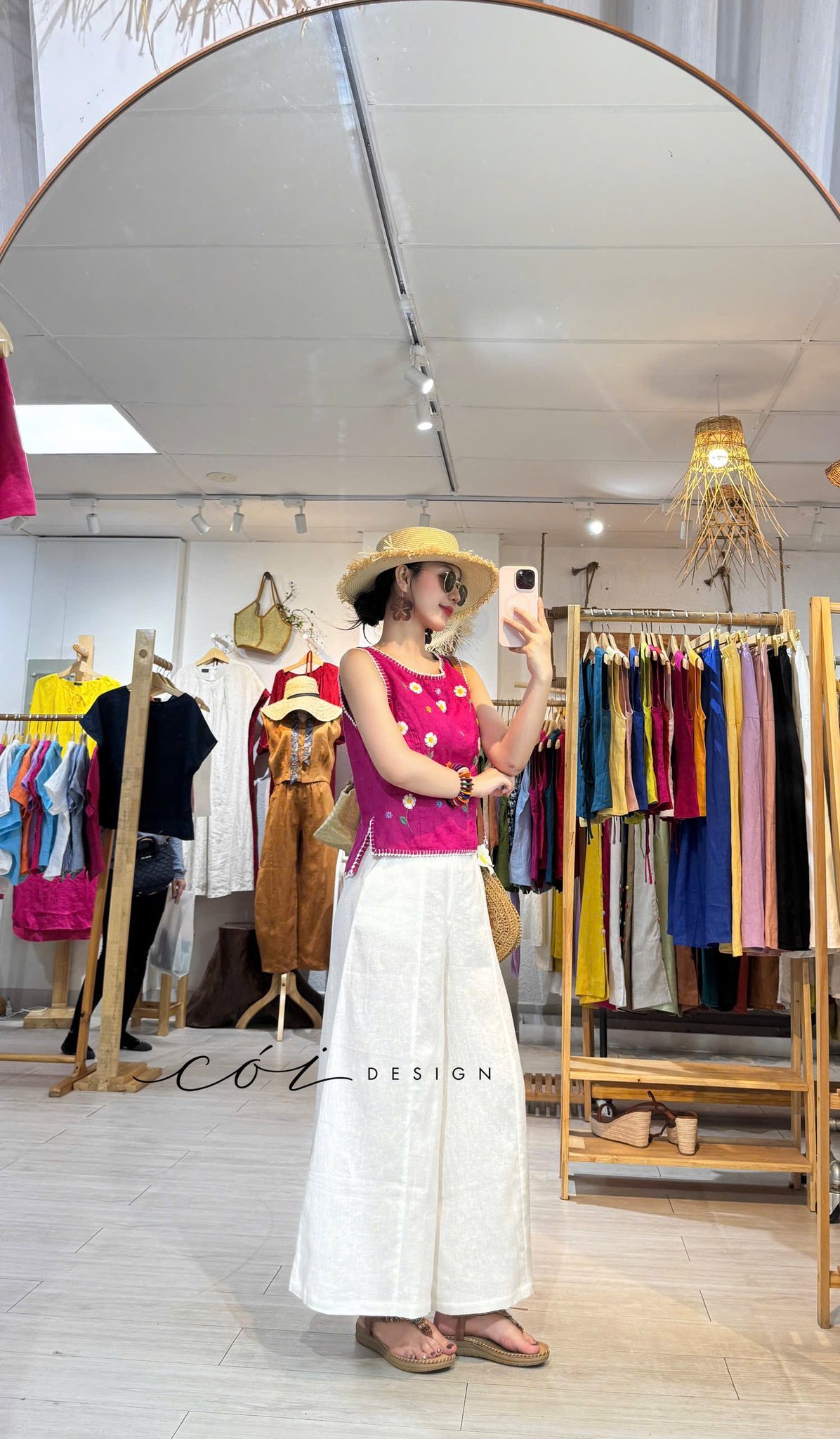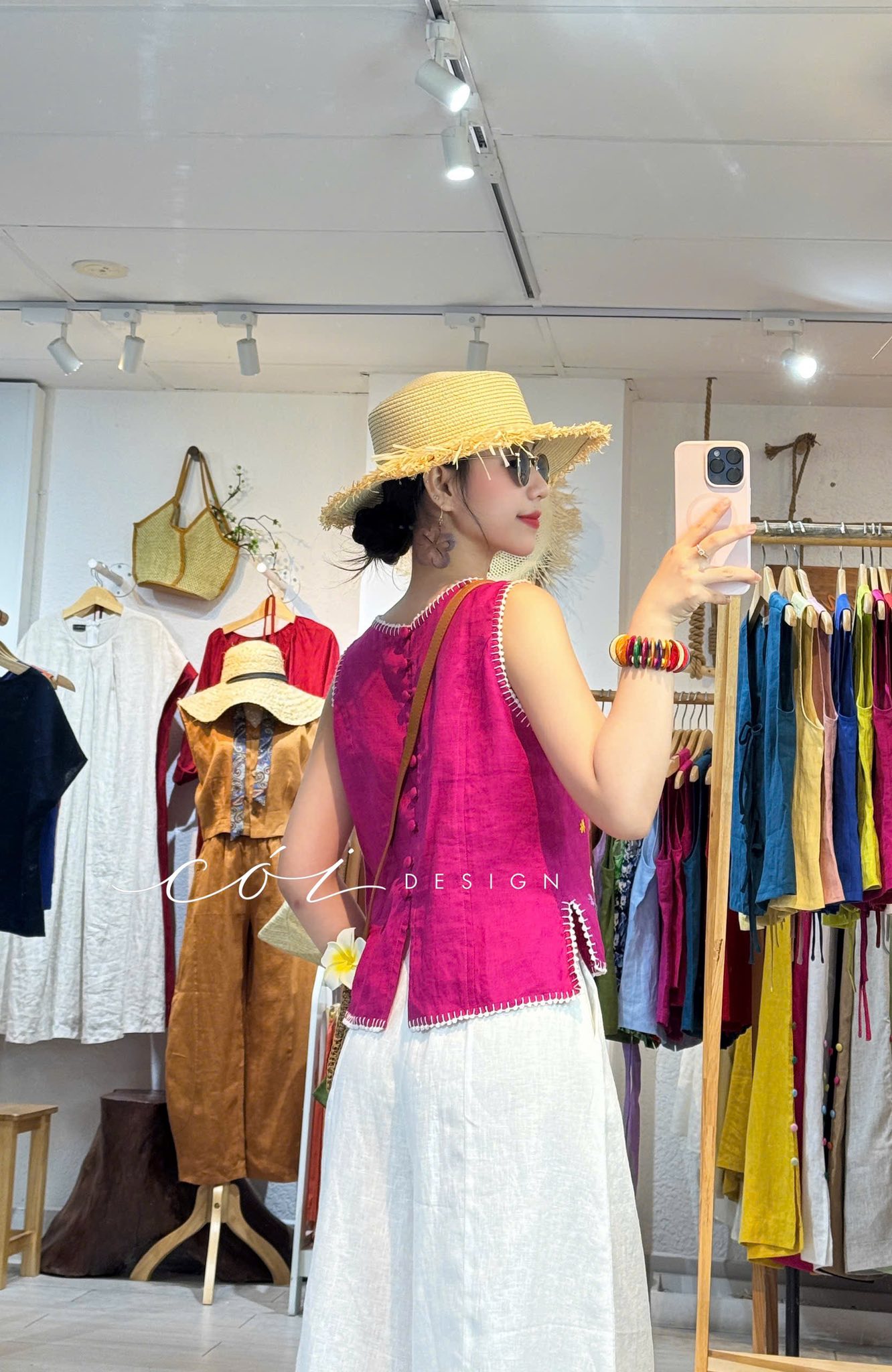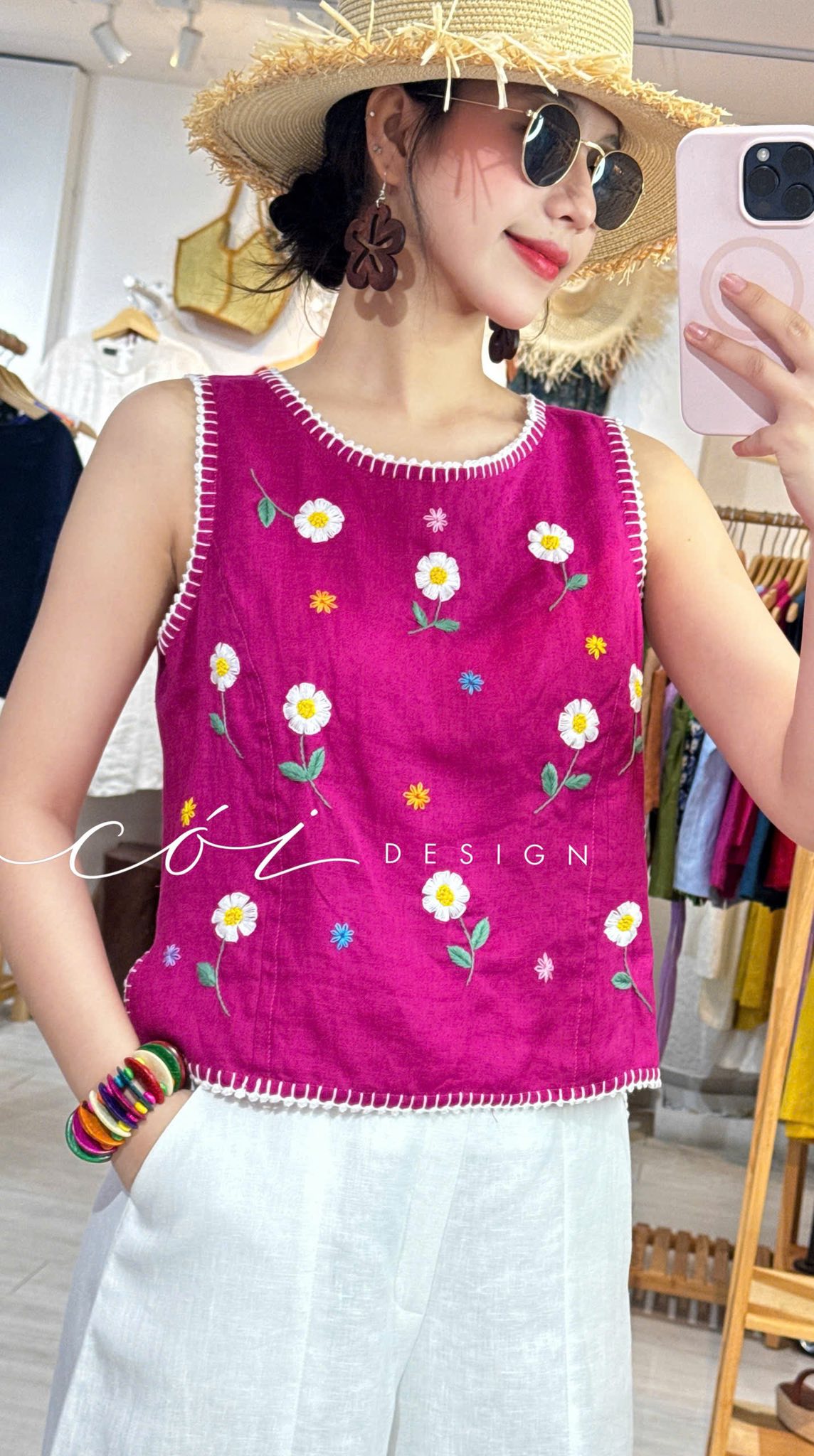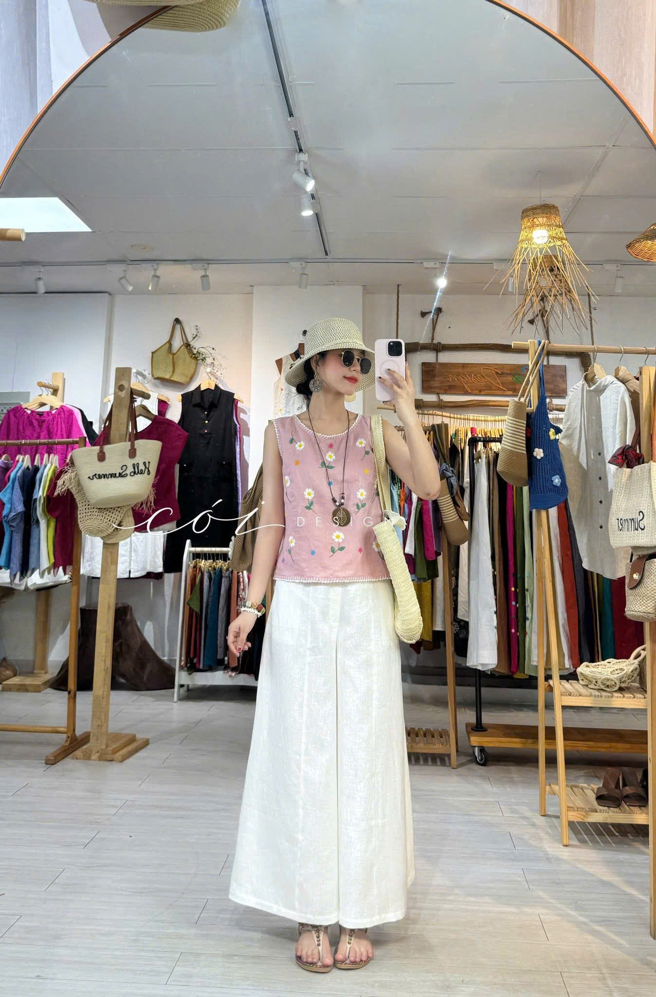 Áo sát nách thêu tay hoa rơi viền sò linen tưng premium Cói Design