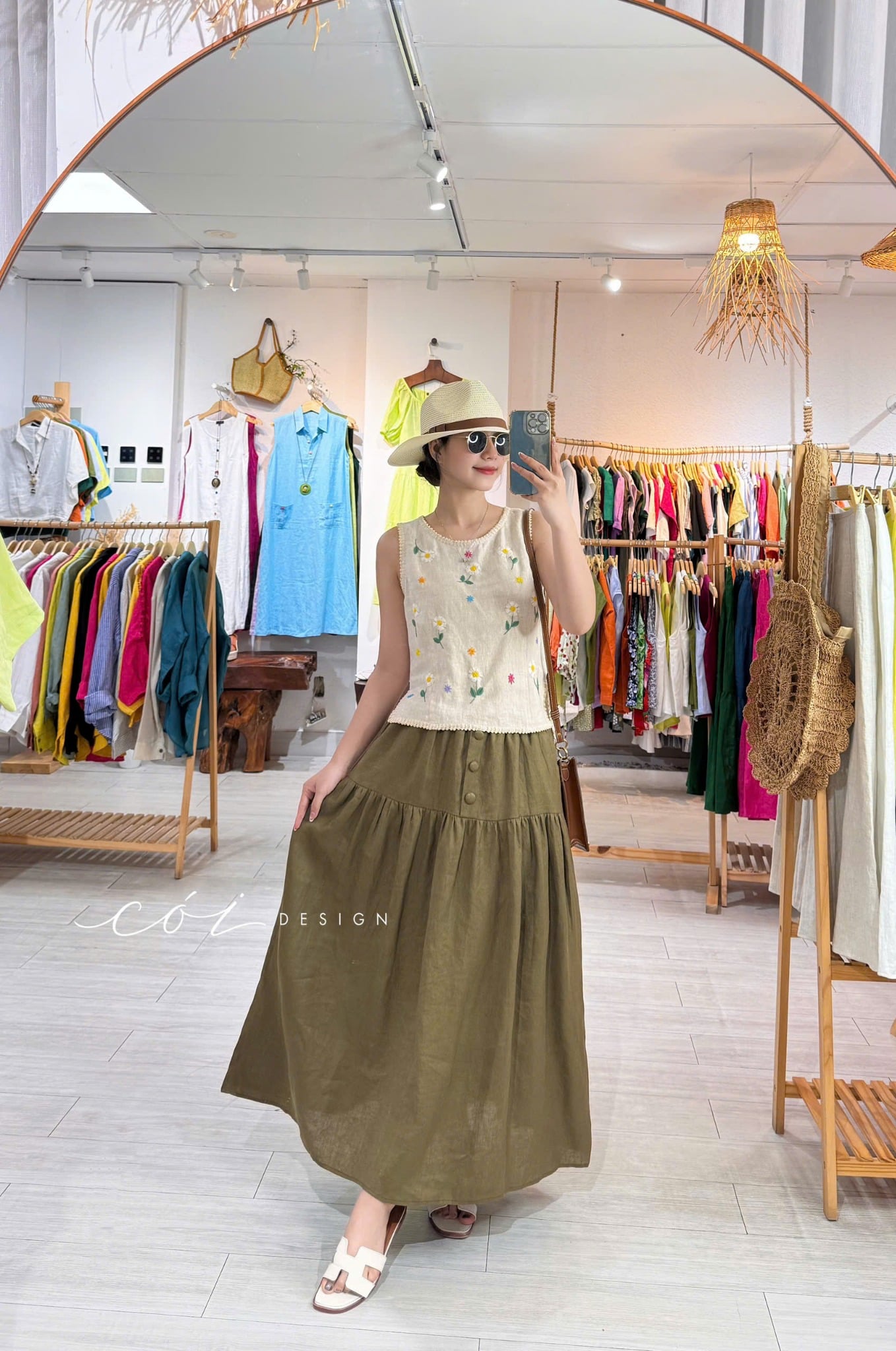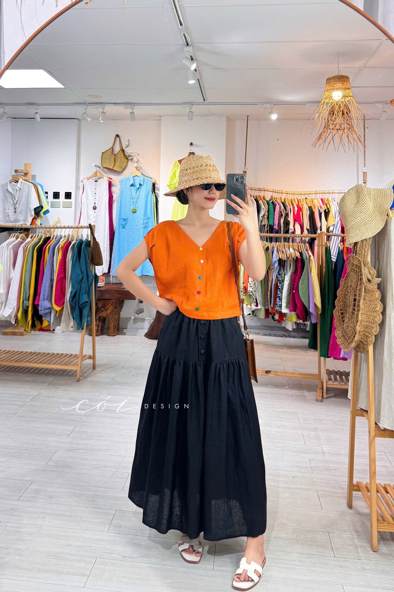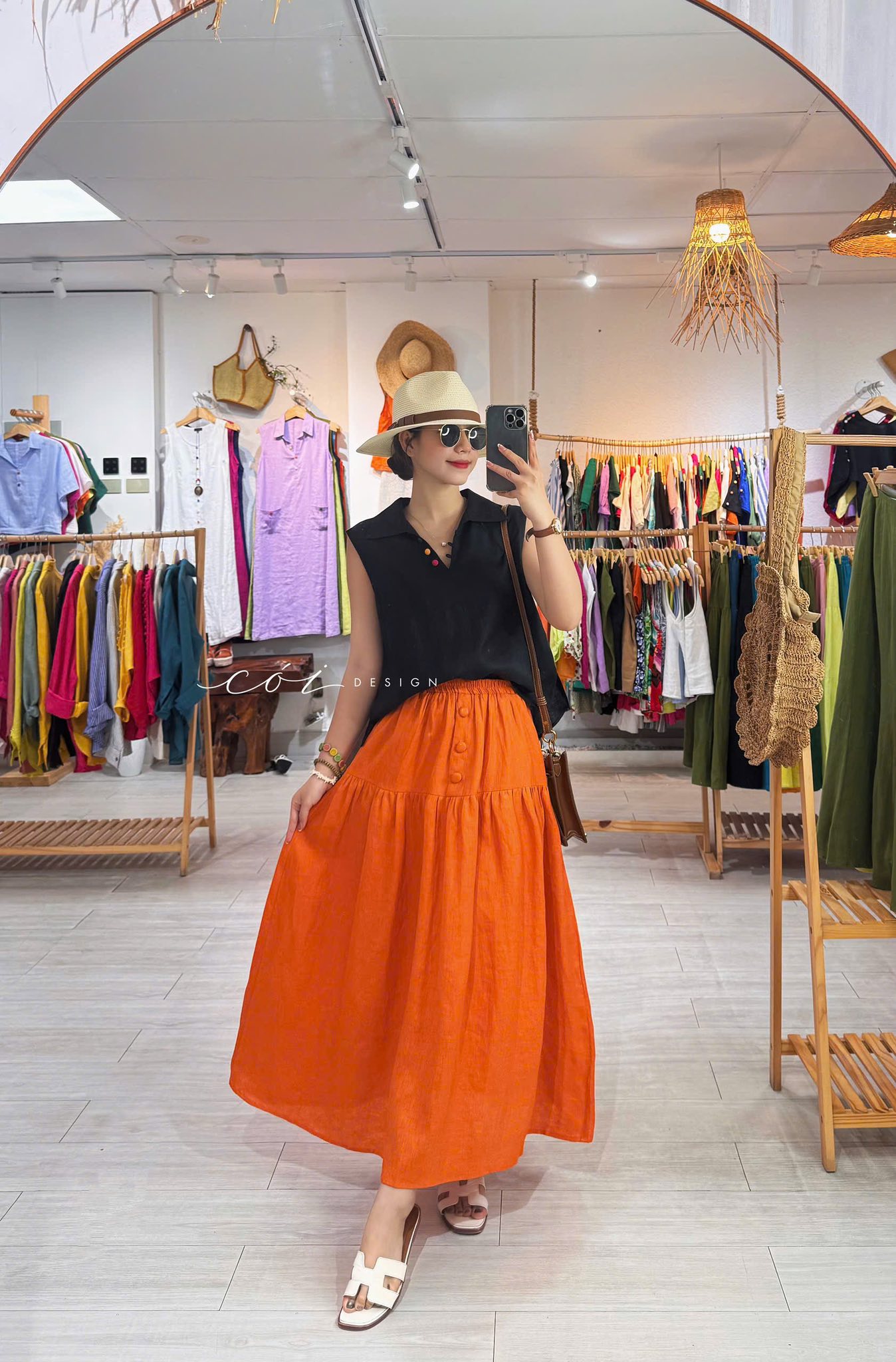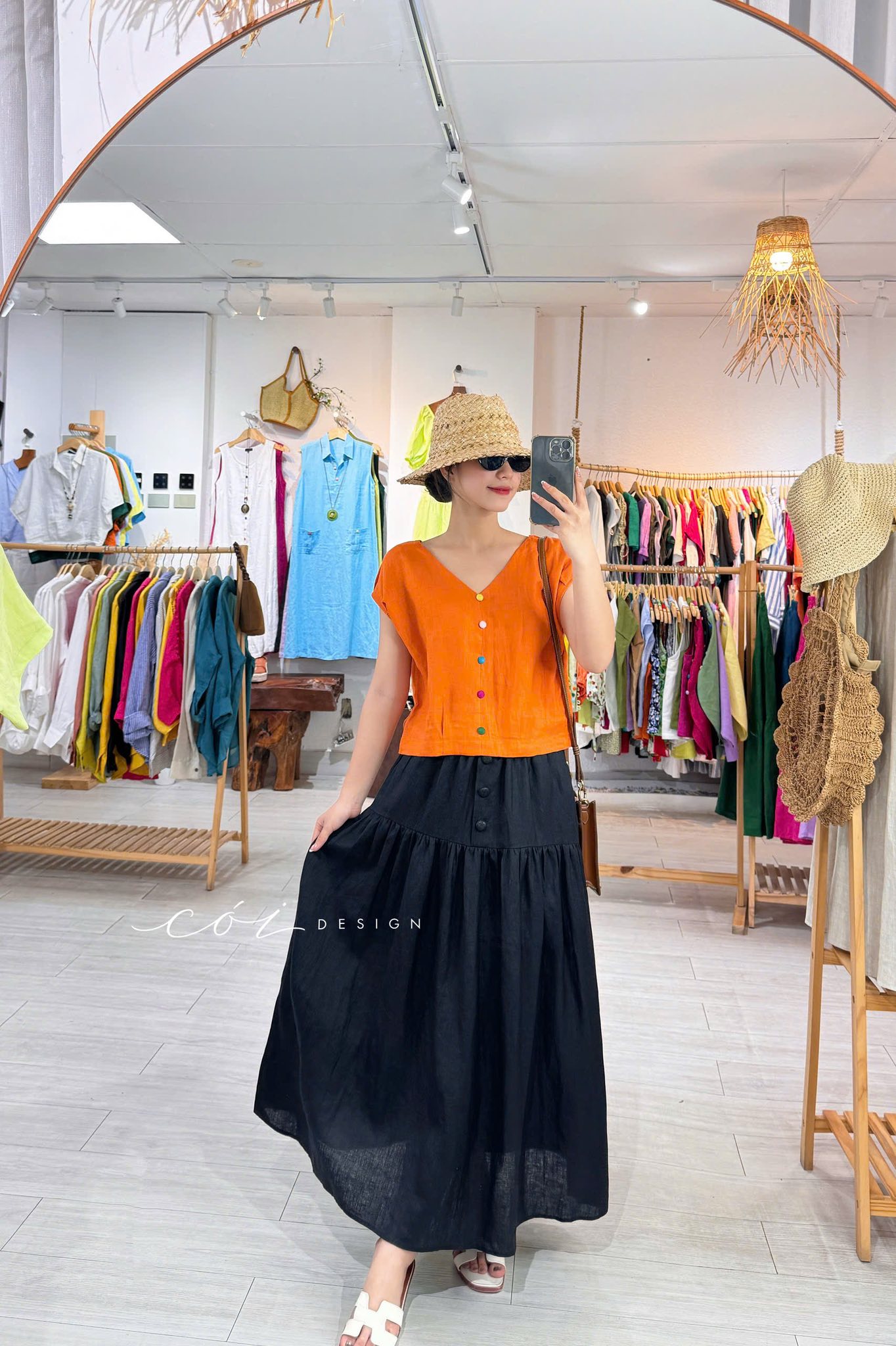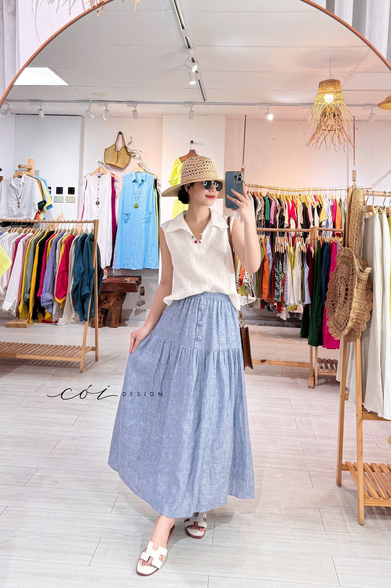 Chân váy 1 tầng nút bọc linen tưng premium Cói Design