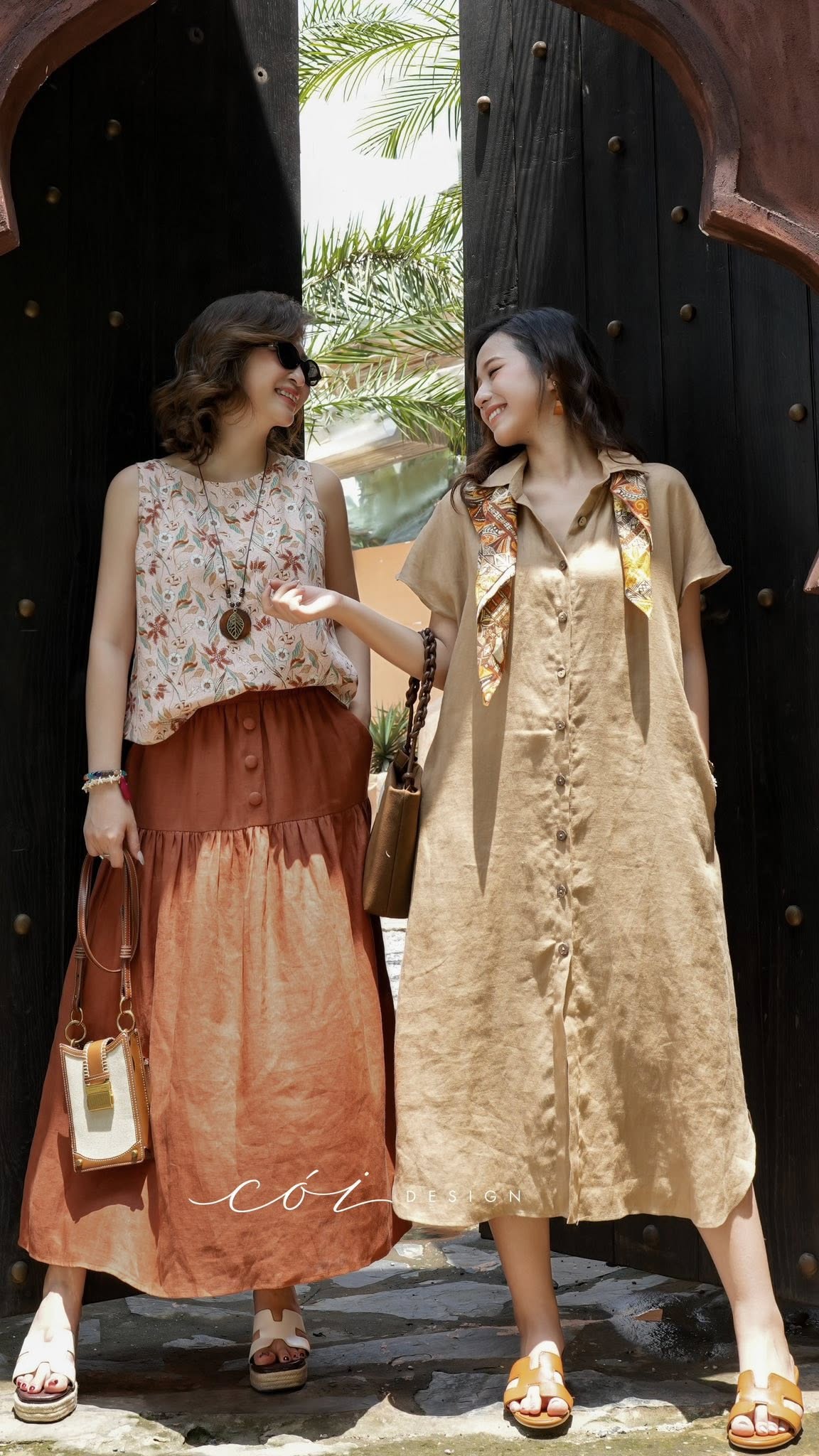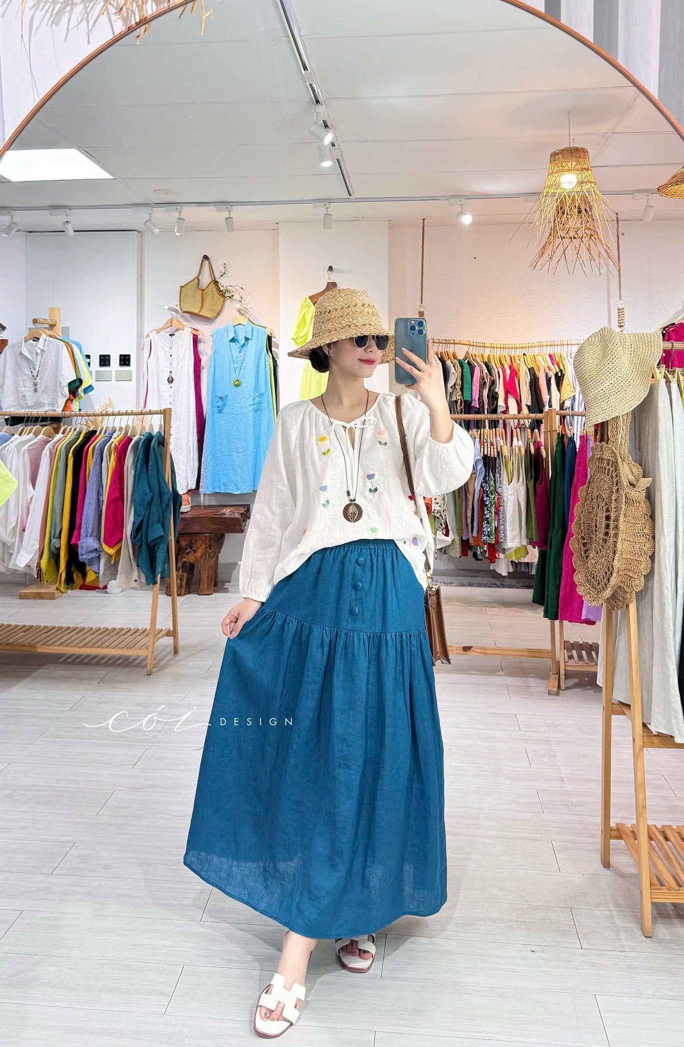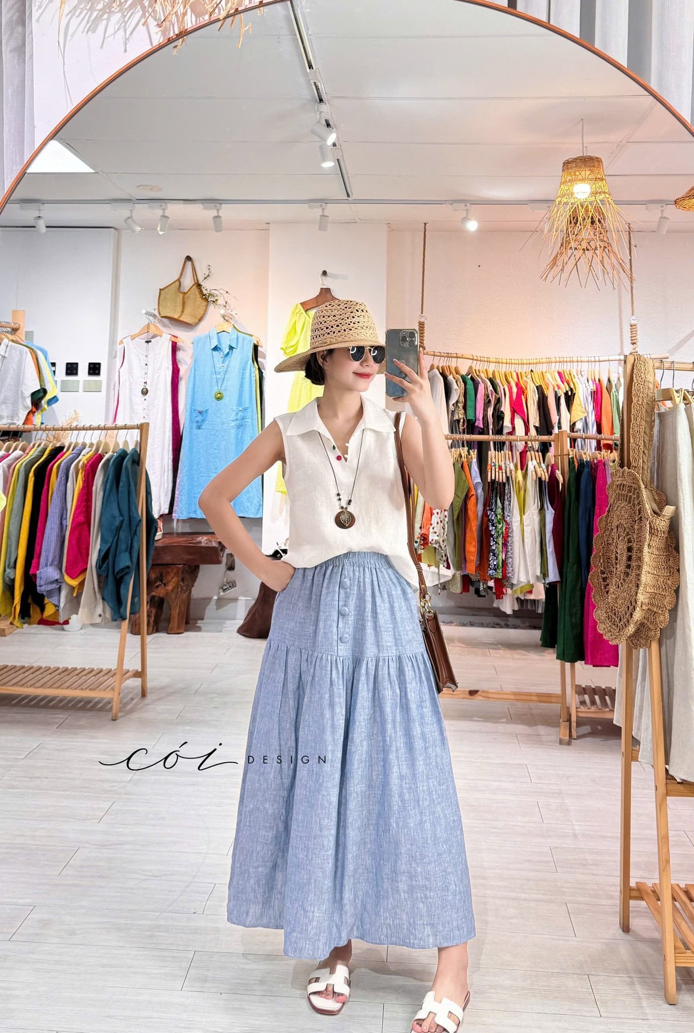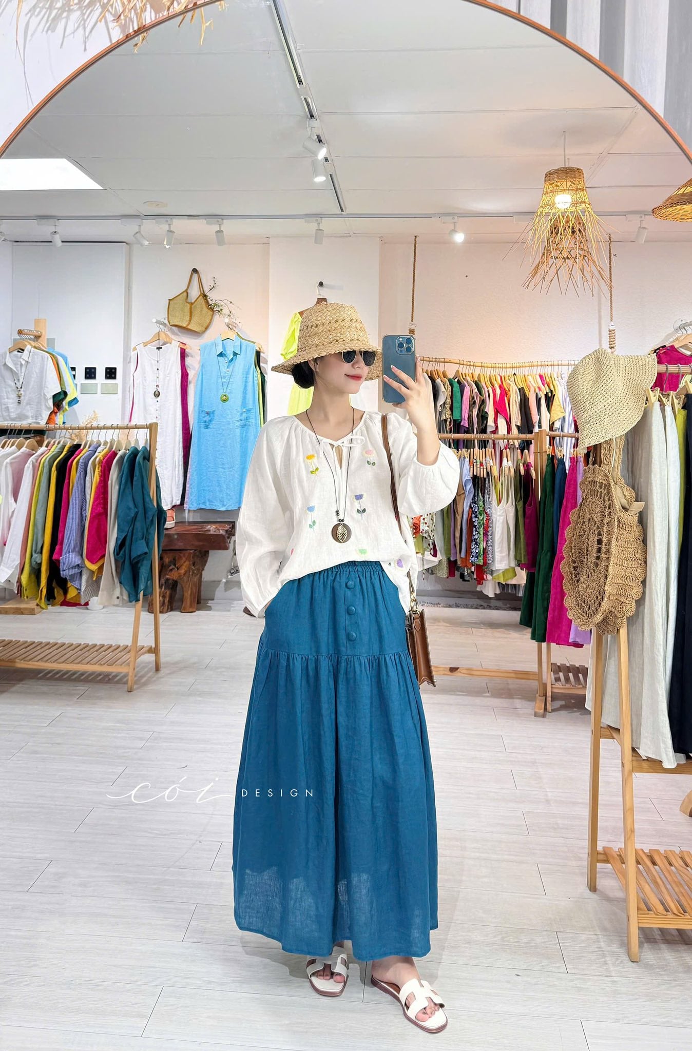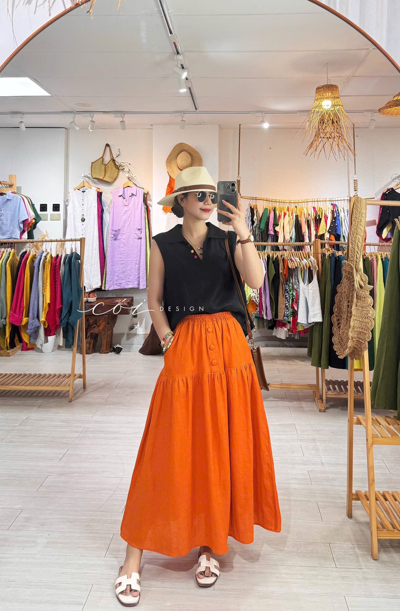 Chân váy 1 tầng nút bọc linen tưng premium Cói Design